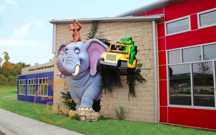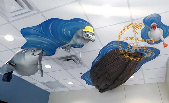 為了增加整體效果,也為節(jié)約成本,幼兒園室內(nèi)門頭后邊的墻壁采用了半景畫制作,門前吊裝的動(dòng)物單片卡紙打印的,既裝飾了幼兒園室內(nèi)門頭,又節(jié)約了成本。