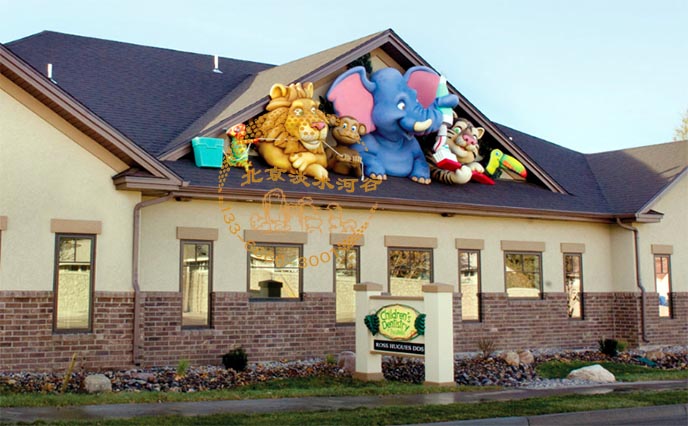 為湖南博納多雙語幼兒園制作的幼兒園室外門面雕塑,巧妙地借助室外的屋頂,把雕塑布置在一起,雕塑制作的材質主要是水泥直塑及玻璃鋼半成品,在制作時主要考慮兒童的喜好,從造型到顏色,最終的目標是吸引小朋友的注意力。好的幼兒園室外門面雕塑能吸引客戶觀察很長時間,北京淡水河谷制作的幼兒園室外門面能給過往的人群留下很深的印象。