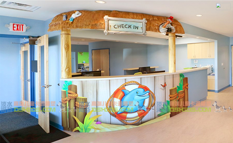 上圖的幼兒園前臺裝飾大船及海景裝飾是用泡沫塑料雕塑制成,表面刷樹脂硬化,空中的大鯊魚是用玻璃鋼制作的,空心的玻璃鋼雕塑因為重量輕,所以吊在空中方便使用。