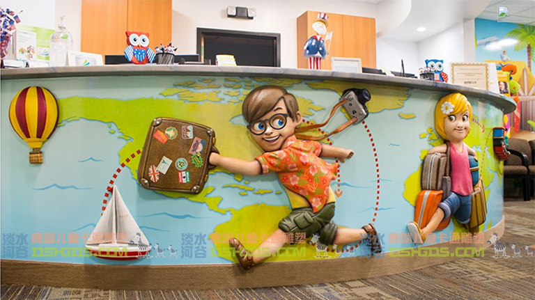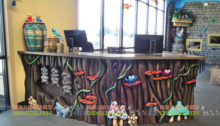 北京廠家設計制作的幼兒園前臺裝飾通常使用泡沫塑料雕塑,然后表面刷樹脂硬化。通過打磨、上色制成,對于要求很精細的幼兒園前臺裝飾雕塑就用傳統的泥塑法,就是先用泥塑出幼兒園前臺裝飾的原型,然后用石膏作出外模,后用玻璃鋼制作出幼兒園前臺裝飾雕塑。